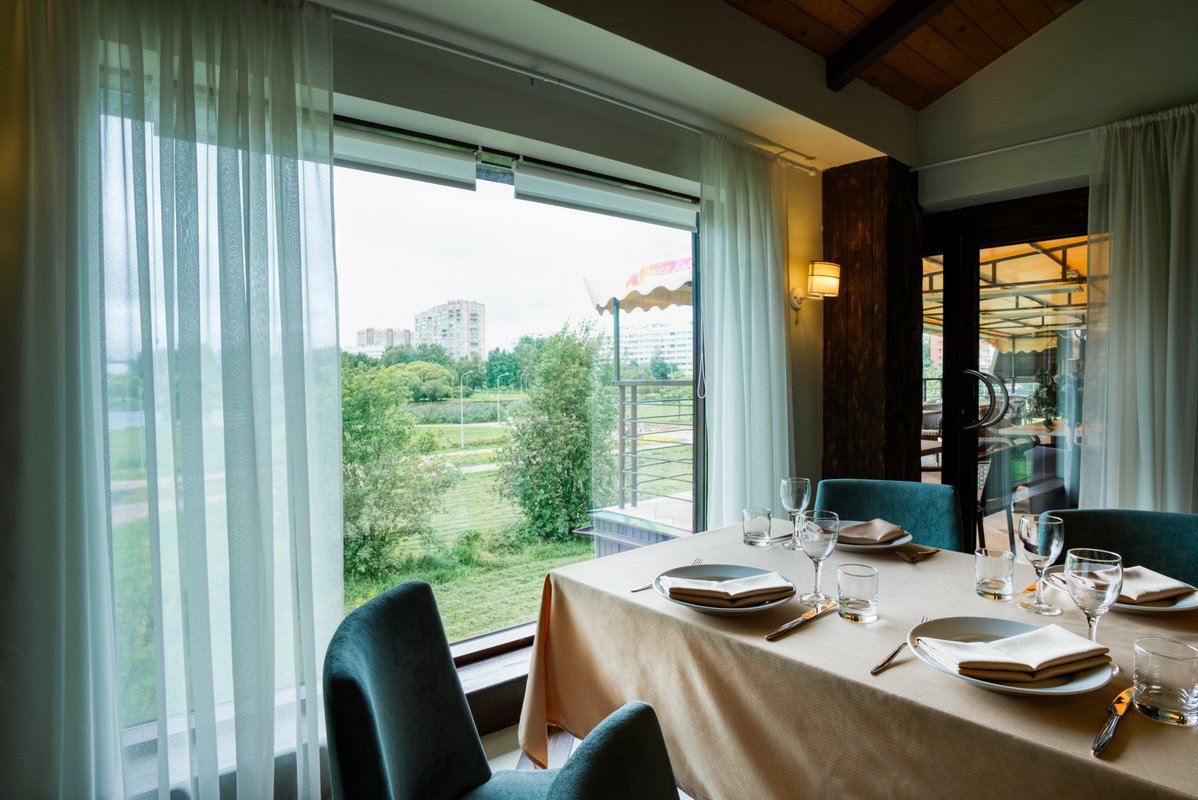 К главному входу устроен удобный парадный подъезд, есть также большая парковка. Выгодное расположение позволит гостям ресторана выйти на прогулку в парк, где можно провести роскошную фотосессию, что особенно актуально для свадебных банкетов: не придется никуда ехать отдельно, поскольку романтические и нежные декорации находятся за окном ресторана.
