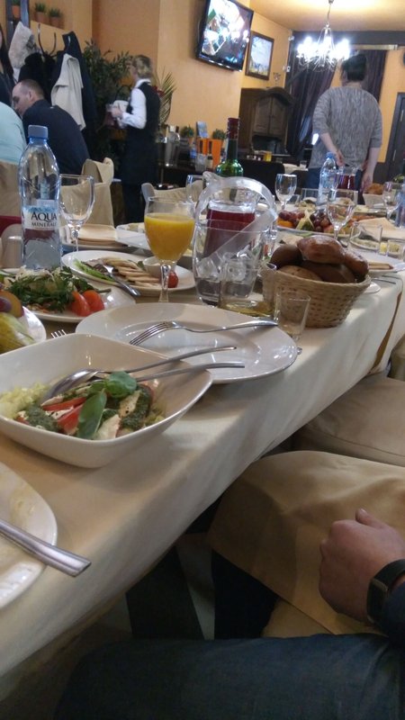 Салаты и закуски размазаны по тарелке, порции маленькие. К нашему времени стол был сервирован неполностью, бутылки с алкоголем открывали ооочень долго.готовы отнестись к этому с пониманием, но настолько затянуть сей процесс могут только непрофессионалы.