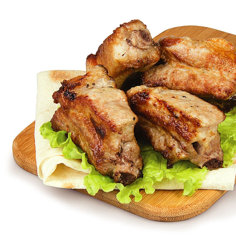 Вкусные сочные свиные ребрышки с румяной корочкой. Доставляем с луком, зеленью и лавашом.
