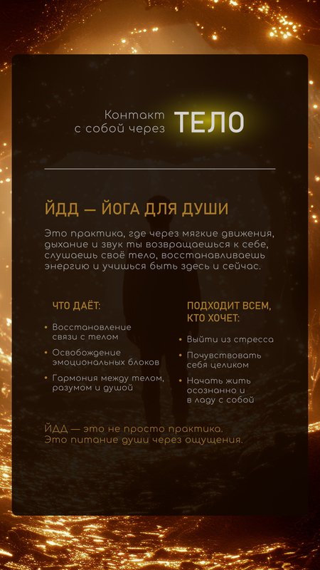 Очень рады, что практики ЙДД нашли в вас отклик и стали неотъемлемой частью вашей жизни. Это самое ценное — когда знания начинают работать на уровне ощущений, становятся естественными и поддерживают каждый день.