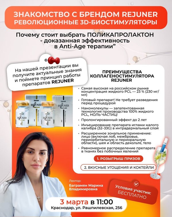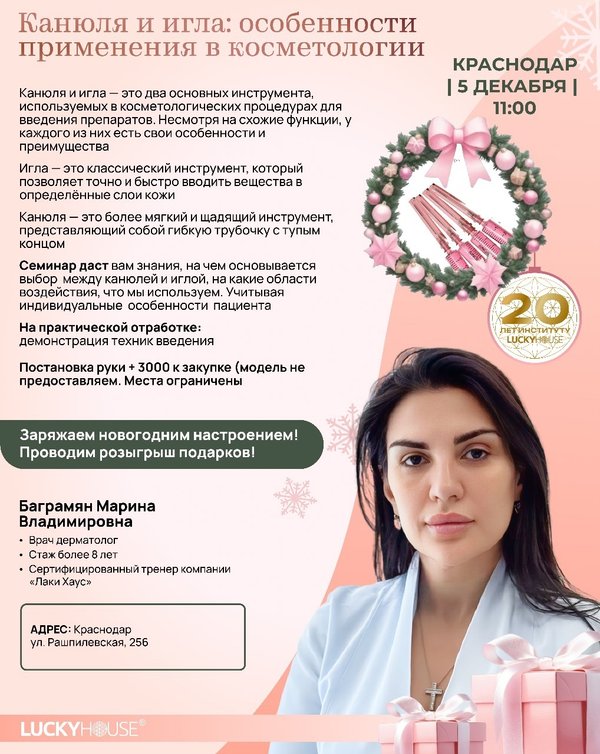 . — Глобальная 3D-ревитализация: восстанавливаем объемы там, где они ушли, и получаем мощный лифтинг-эффект + улучшение качества кожи. 3. Работа с телом. Да, ПЛА работает не только на лице,например, при помощи нее можно качественно провести коррекцию возрастных изменений кистей и зоны декольте. 4. Алгоритмы и техники. Глубины введения. Планирование курсового лечения. 5. Разбор клинических случаев. Реальные кейсы, тактики и результаты. 6. Осложнения. Профилактика, тактика коррекции, как выходить из сложных ситуаций быстро и профессионально. 7. И ГЛАВНОЕ: Демонстрация на моделях. Вы увидите всё своими глазами. Техники, нюансы, «фишки» от практикующего тренера. ТРЕНЕР: Баграмян М. В., врач-дерматолог, практикующий косметолог, сертифицированный тренер компании «Лаки Хаус». УСЛОВИЯ УЧАСТИЯ: Закупка препаратов по теме семинара на минимальную сумму от 7000 руб. Участвуют бренды Eldermafill и Bellarti, REJUNER, Anubis Barcelona. ️Мест осталось немного, поэтому оставляйте свои заявки по тел./TG/Max:.