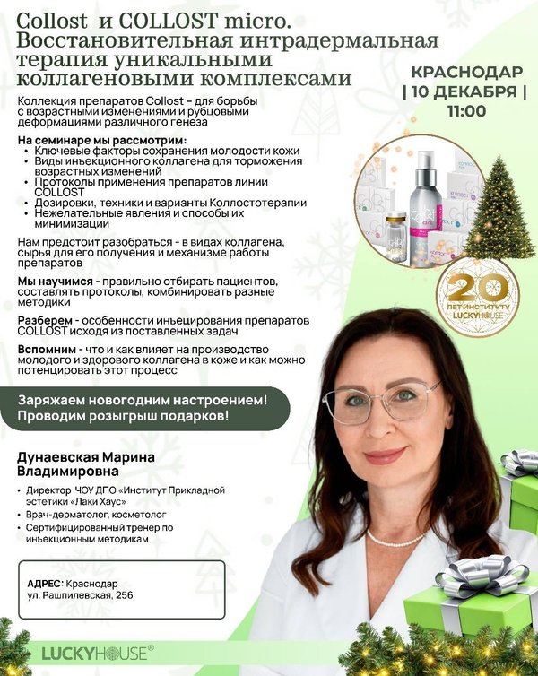 отоколы и тактики: работа с фотостарением, потерей тонуса, стриями, постакне. Практика в реальном времени: демонстрация техник инъекций, отработка на пациентах, алгоритмы реабилитации. Как продавать услугу: скрипты консультации и программы лояльности. ️ Спикер: Дунаевская М.В., врач-косметолог, директор ЧОУ ДПО «Институт прикладной эстетики „Лаки Хаус“». ️ Условия участия: закупка препаратов COLLOST или Anubis Barcelona на минимальную сумму от 7000 руб. Ждем ваших записей по тел.: