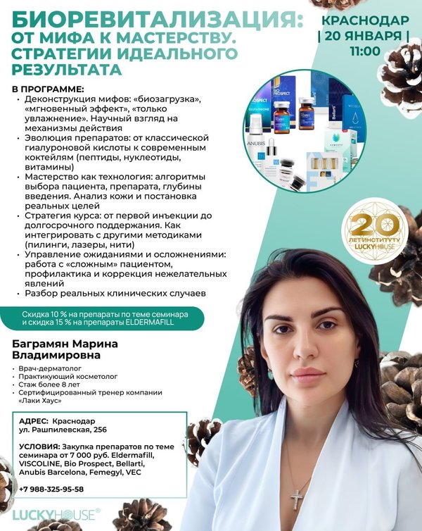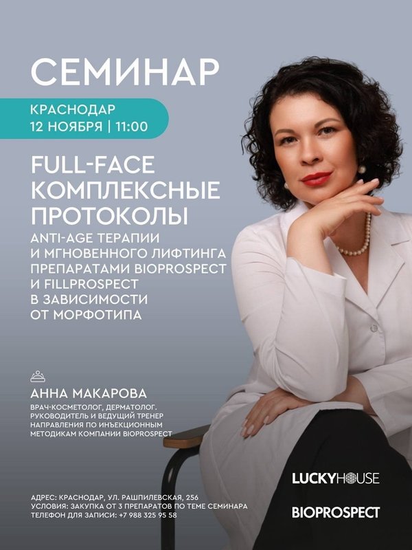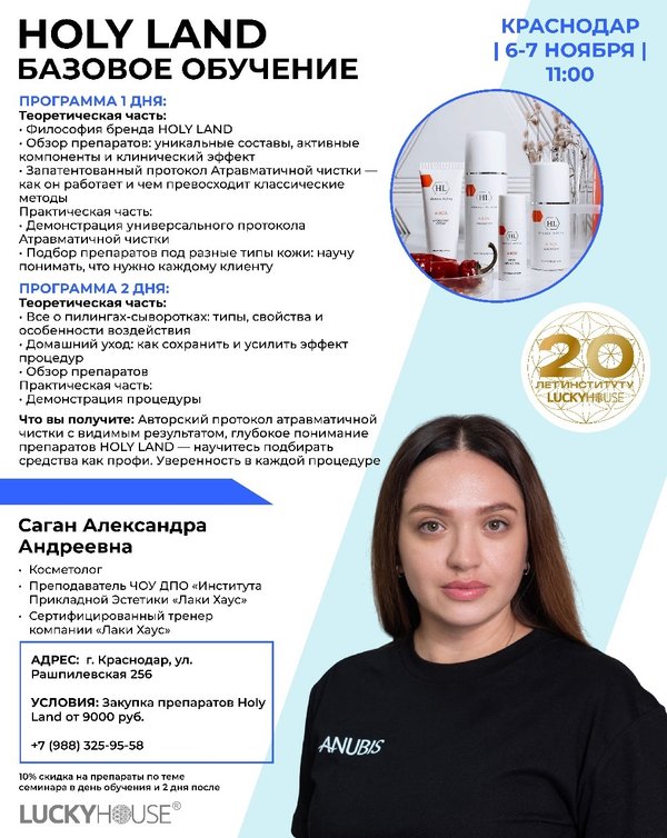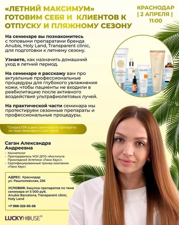 терии выбора протокола под тип кожи зимой. Сезонные протоколы: пошаговые алгоритмы для стабильного результата и удержания клиента. Процедуры «на выход»: безопасные и эффектные методики, которые можно сразу предлагать пациентам. Практика: каждый участник выполнит профессиональный протокол «на себе», чтобы прочувствовать технику процедуры и эффект продуктов в спокойной обстановке. Лектор: Саган А.А., врач-косметолог, преподаватель Института прикладной эстетики «Лаки Хаус», сертифицированный тренер. Условия участия: закупка продукции Anubis Barcelona или Holy Land от 5 000 руб. Регистрируйтесь заранее по тел./WA!