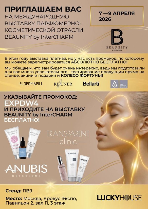 ПРИГЛАШАЕМ ВАС НА МЕЖДУНАРОДНУЮ ВЫСТАВКУ ПАРФЮМЕРНО-КОСМЕТИЧЕСКОЙ ОТРАСЛИ BEAUNITY by InterCHARM 7—9 апреля Крокус экспо, Павильон 2, зал 11, стенд 11В9 Мы обещаем, что вам будет очень интересно, ведь мы подготовили для вас много увлекательного — тестирование продукции прямо не стенде, акции и подарки и КОЛЕСО ФОРТУНЫ! Регестрируйтесь по ссылке Промокод EXPDW4 7—8 апреля с 10:00 - 18:00 9 апреля с 10:00 - 17:00