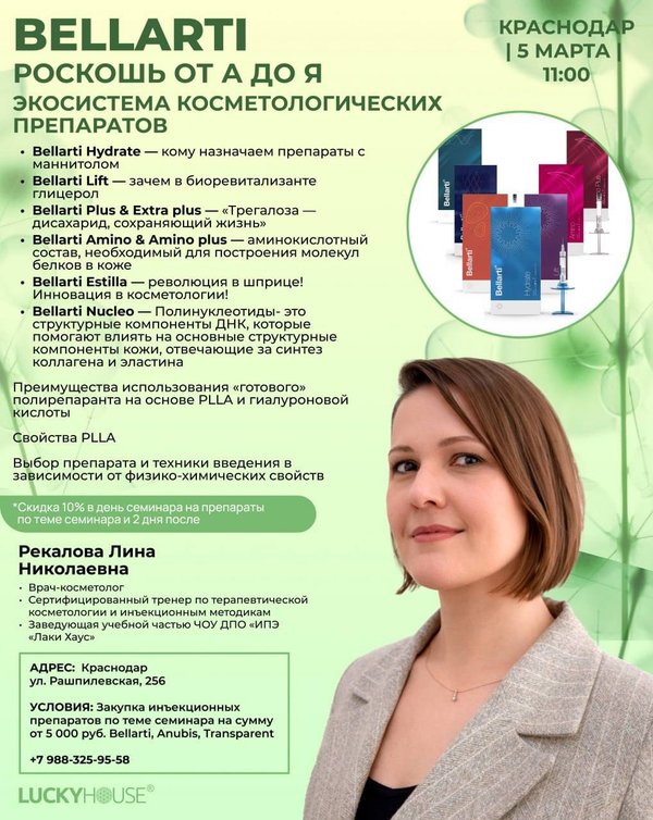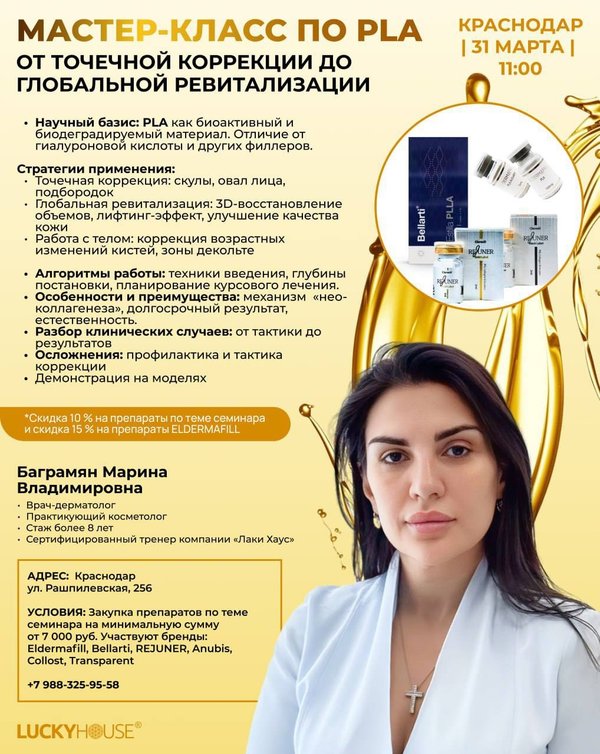 ые и безболезненные процедуры, которые возвращают натуральность и удерживают клиента. Условие участия: закупка от 5 000 руб. (Anubis Barcelona, Transparent Clinic). ️ 31.03.2026, 11:00–16:00 «Мастер‑класс по PLA» Эксперт: Баграмян М. В., врач-дерматолог, практикующий косметолог, преподаватель ЧОУ ДПО «Института Прикладной Эстетики „Лаки Хаус»“, сертифицированный тренер. Все методики: от точечной коррекции до 3D‑ревитализации и работы с телом. Научные основы PLA, техники введения, планирование курсов, механизм нео‑коллагенеза, разбор осложнений и тактика их решения. Демонстрация на моделях. Условие участия: закупка препаратов по теме от 7 000 руб. (Eldermafill, Bellarti, REJUNER, Anubis Barcelona). Места ограничены — записывайтесь заранее! Тел/TG/Max:.
