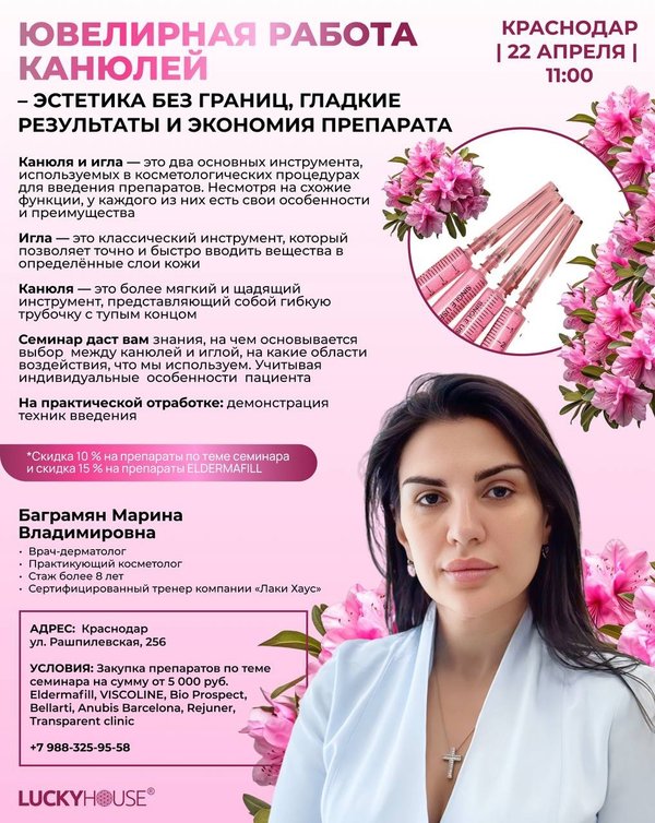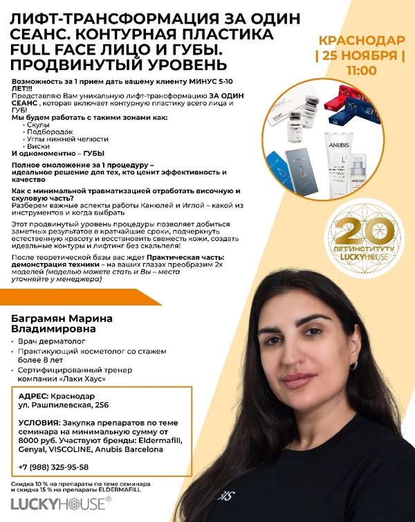 rmafill, Genyal, VISCOLINE, Anubis Barcelona. Это идеальный семинар для тех, кто хочет вывести процедуры на новый суперэффективный уровень, при этом сохраняя естественные черты лица пациента ️ Ведущий: Баграмян М.В., врач-дерматолог, практикующий косметолог с опытом более 8 лет, сертифицированный тренер компании «Лаки Хаус». ️ Условие участия: закупка препаратов по теме семинара на минимальную сумму от 8000 руб. (участвуют бренды Eldermafill, Genyal; VISCOLINE, Anubis Barcelona). Ждем ваших записей по тел/WA