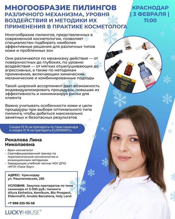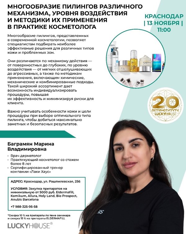 ься с актуальными трендами и авторскими протоколами. Что вас ждет? Фундамент — классификация пилингов по виду и уровню воздействия, выбор идеального пилинга для любой кожи и задачи. Стратегия и тактика — комбинирование протоколов, работа с проблемными зонами лица, использование пилингов в составе комплексных программ. Практика и безопасность — разбор реальных кейсов, алгоритмы обработки осложнений, создание долгосрочных курсов ухода. Лектор: Баграмян М.В., врач-дерматолог, практикующий косметолог, сертифицированный тренер компании «Лаки Хаус». Условия участия: покупка препаратов по теме от 5000 рублей (Allura, Kemikum, Bio Prospect, Eldermafill, Anubis Barcelona). Воспользуйся возможностью вывести свою работу с пилингами на новый уровень! Записывайтесь по тел/WA