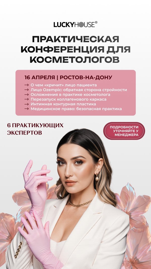 Конференция для косметологов в Ростове-на-Дону Компания Lucky House приглашает специалистов эстетической медицины на практическую конференцию, которая состоится 16 апреля в Ростове-на-Дону. Мероприятие объединит ключевые направления современной практики — актуальную косметологию и эстетическую гинекологию, а также разбор осложнений и юридических аспектов работы специалиста.