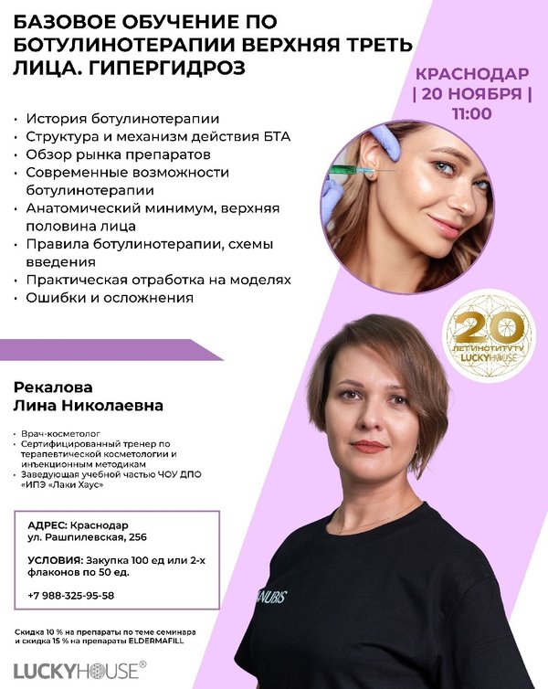 осложнениями. ️ Ведущая: Рекалова Л.Н. — врач-косметолог, сертифицированный тренер по терапевтической косметологии, заведующая учебной частью ЧОУ ДПО «ИПЭ „Лаки Хаус“». Условия участия: закупка 100 ед или 2- юх флаконов по 50 ед. ⏩ Этот семинар — отличная возможность получить актуальную базу по ботулинотерапии, расширить профессиональные навыки и спектр своих услуг! Записывайтесь по тел/WA