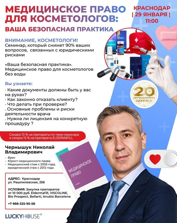 Transparent Clinic, Rejuner. 2 Семинар 24 апреля | 11:00 Медицинское право для косметологов Лектор: Чернышук Николай Владимирович Семинар, который снимет 90% ваших вопросов, связанных с юридическими рисками Разберем вопросы о документах, проверках, юридических рисках, лицензировании и безопасной практике. Условия участия: закупка препаратов по теме семинара на сумму от 10000 руб. Eldermafill, Viscoline, BioProspect, Bellarti, Anubis Barcelona, Transparent Clinic, Rejuner, VEC, Collost, Holy Land, Genyal, Kemikum. Для участников семинаров действует скидка 10% и 15% на препараты Eldermafil Адрес: Рашпилевская, 256, 4 этаж Запись: Полезно, практично и без воды — всё, что нужно специалисту, чтобы работать увереннее.