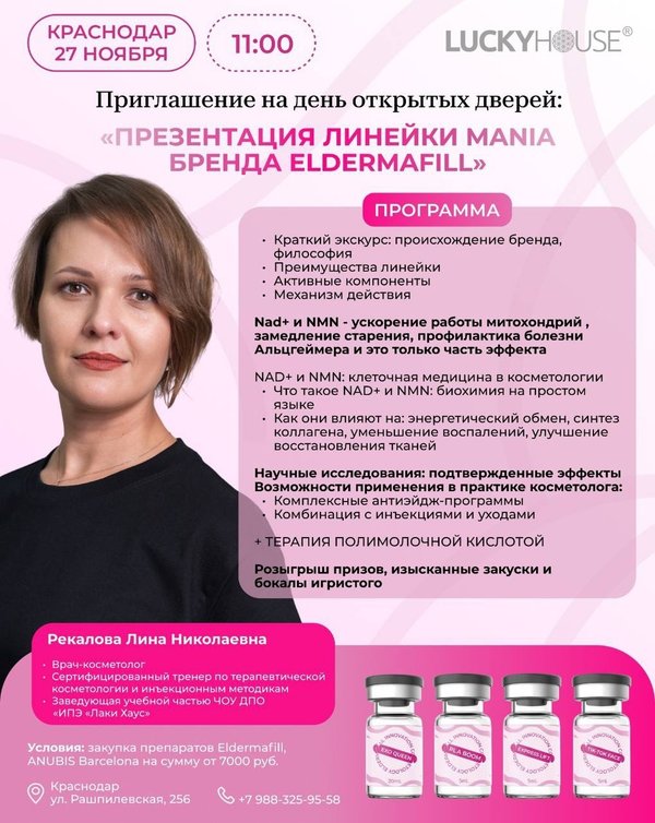 ткие рекомендации: кому и как рекомендовать эти продукты для максимального и естественного результата. Практическая демонстрация техники введения самых интересных препаратов. Эксперт: Рекалова Л.Н., врач-косметолог, сертифицированный тренер по терапевтической косметологии и инъекционным методикам; заведующая учебной частью ЧОУ ДПО «ИПЭ „Лаки Хаус“». Условия участия: минимальная покупка препаратов ELDERMAFILL или ANUBIS Barcelona на сумму от 7 000 руб. Будьте в тренде и изучите прогрессивные решения в инъекционном омоложении! Регистрация по телефону/WhatsApp: