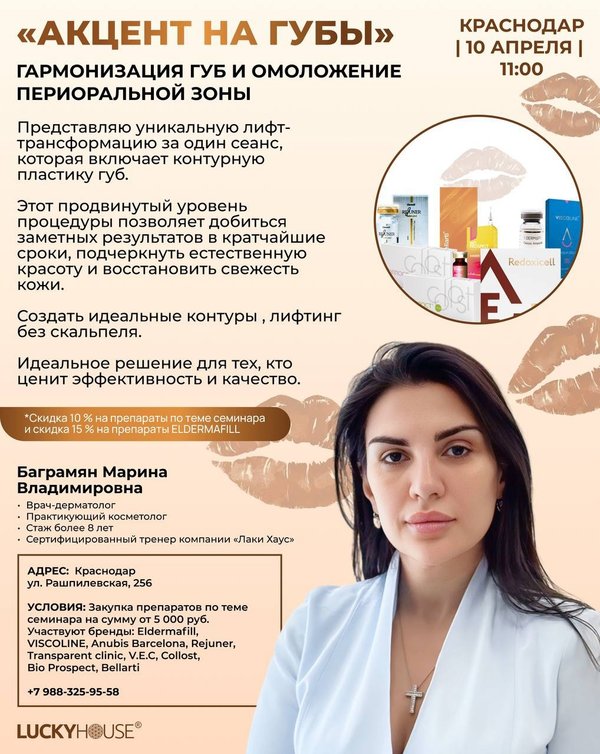«сложной» зоне. Секрет объема, который выглядит естественно. Протоколы омоложения периоральной области. «Золотые пропорции» в гармонизации губ. ПРАКТИКА (отработка на моделях): Покажем и поставим руку на: ️ Техниках гармонизации ️ Коррекции уголков рта (брыли, опущенные уголки — убираем!) ️ Проработке «рамки» губ ️ Разборе ошибок и осложнений ️ Синергии методик (составлении идеального протокола). ЭКСПЕРТ: Баграмян М. В., врач-дерматолог, практикующий косметолог, сертифицированный тренер компании «Лаки Хаус» БОНУСЫ УЧАСТНИКАМ: Скидка 10% и 15% на ВСЕ препараты. УСЛОВИЯ УЧАСТИЯ: закупка от 5000 руб. (Eldermafill, Viscoline, Rejuner, VEC, Collost, BioProspect, Bellarti, Anubis Barcelona, Transparent Clinic и другие). ЗАПИСЬ ПО ТЕЛ/Max:. Не упустите возможность повысить чек и качество своих работ!