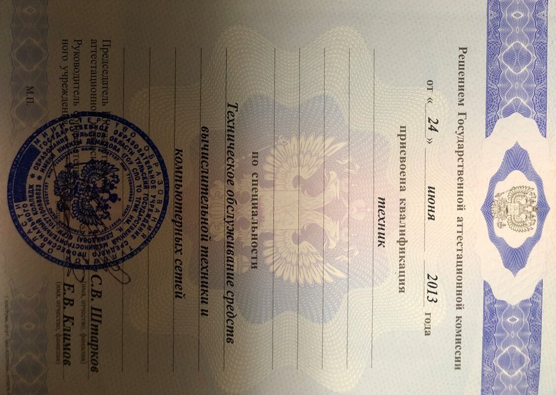 2013 — Тульский государственный машиностроительный колледж им. Н. Демидова, специальность – техническое обслуживание средств вычислительной техники и компьютерных сетей, техник