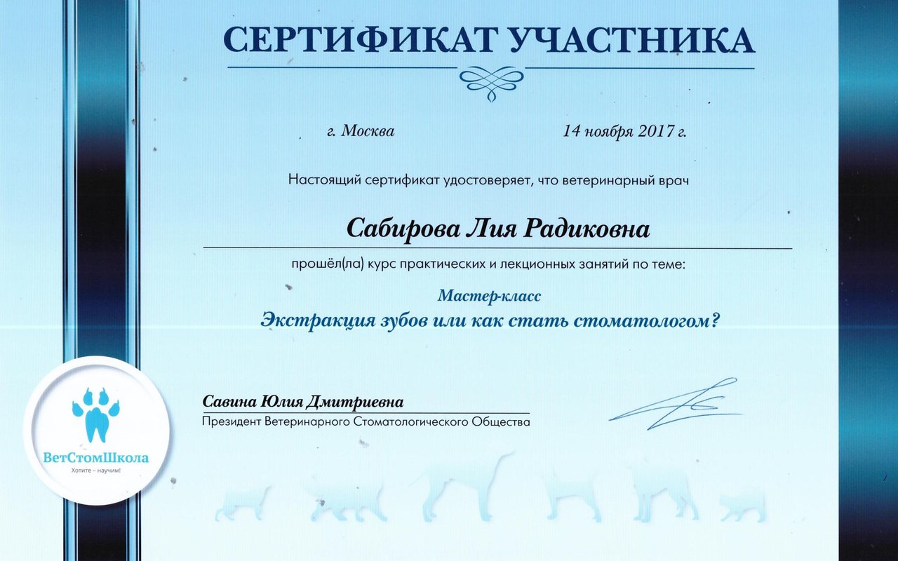 2017г прошла мастер-классы по ветеринарной стоматологической рентгенологии под руководством Савиной Ю.Д. (президент ветеринарного стоматологического общества)