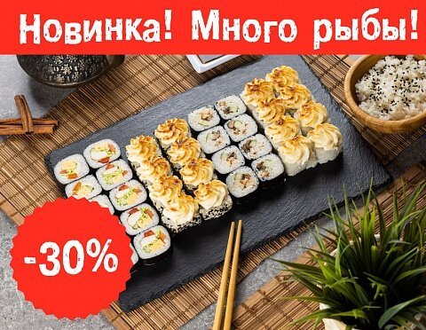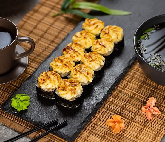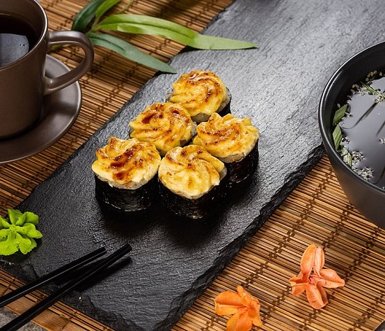 Японский рис, мидии, соус «Унаги», кунжут, соус спайси