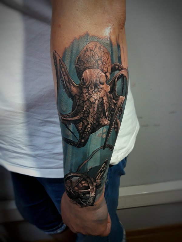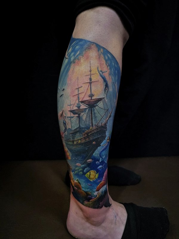 Перекрыли не большой партачок. Пришла как то девушка на сеанс, говорит надо перекрыть партачок, русалкой (смотрите в конце карусели что было и чем просили перекрыть), в итоге вышел вот такой подводный мир. Как вам перекрытие, можете написать в комментариях.