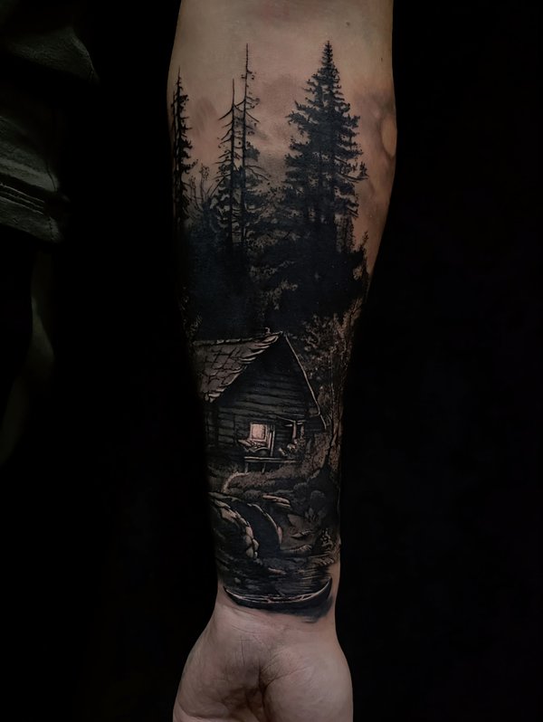 Пока делали эту татуировку, захотелось оказаться в домике на берегу реки.