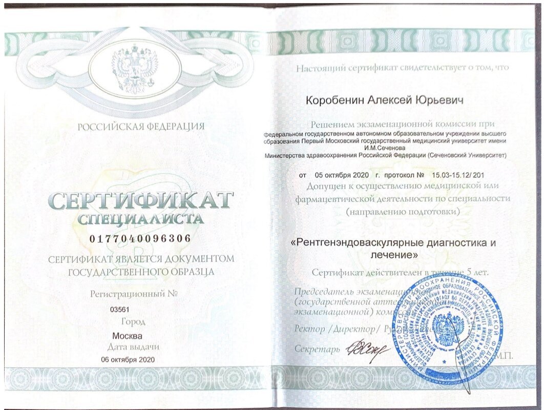 2011 — Первый московский государственный медицинский университет им. И.М. Сеченова (рентгенэндоваскулярные диагностика и лечение)