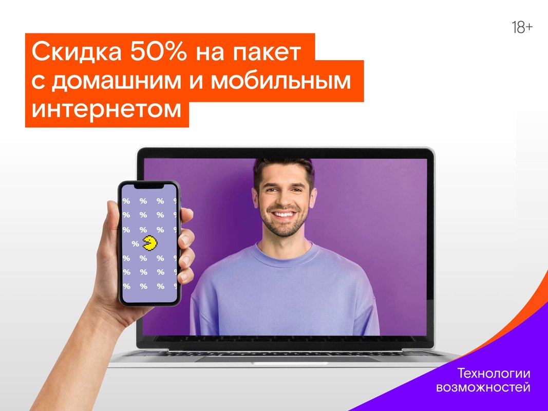 Комплекты услуг со скидкой: домашний интернет + интерактивное ТВ, домашний + мобильный интернет.