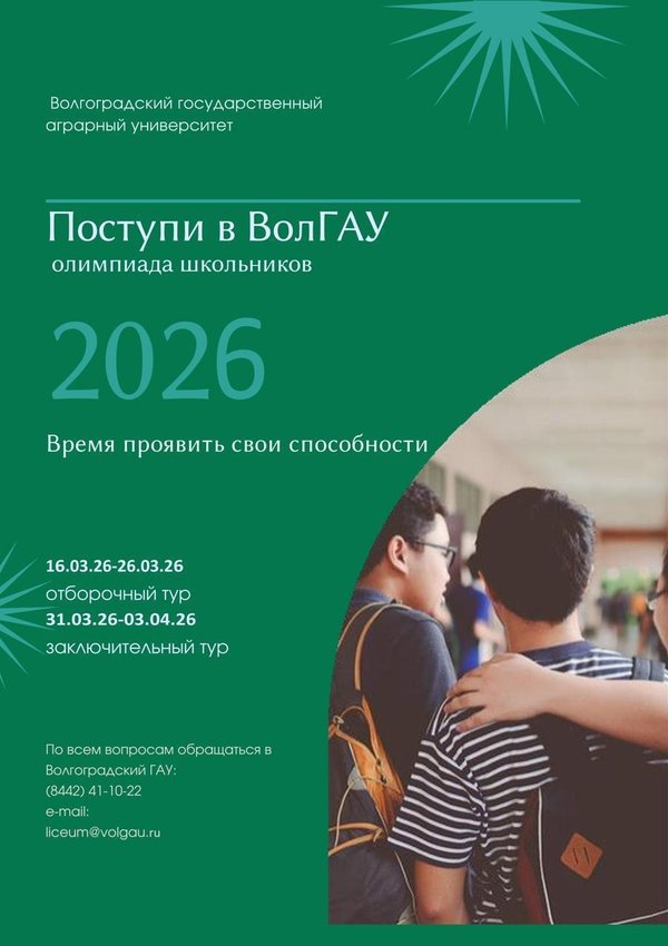 ветеринария; — ОБиЗР; — история и обществознание Для участия в мероприятии необходимо зарегистрироваться: К участию в заключительном этапе допускаются обучающиеся, прошедшие отборочный тур. Соорганизатором олимпиады выступает региональный Центр одаренных детей Волгоградской области. Внимание! Все победители и призеры олимпиады получат 10 дополнительных баллов при поступлении в Волгоградский государственный аграрный университет. Всю дополнительную информацию можно узнать по телефону или на сайте лицея -