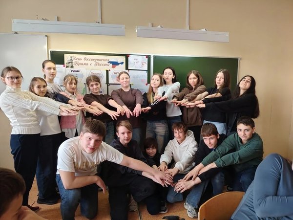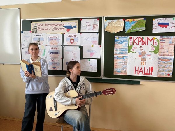 классный час «Крымская весна». Ребята узнали об истории полуострова, его природе и культуре, также прошёл конкурс рисунков «Широка страна моя родная» Ученики 6 А класса изготовили стенгазету «Крым с нами навсегда» В 4 Б классе наставники Орлят России совместно с классным руководителем Токарь Т.А. провели мастер-класс по изготовлению открытки. Ученики 11 класса приняли участие в викторине на знание истории Крыма в рамках акции «Одна страна-одна история» Крым с Россией навсегда — это не просто фраза, это наша история, наша культура и наше будущее.