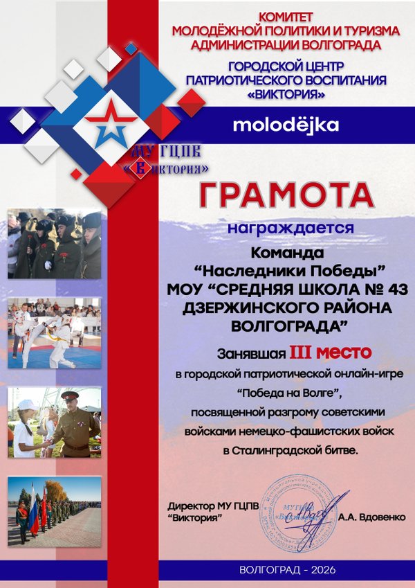 Гордо поднимаем знамя нашей команды! Команда «Наследники Победы» заняла почетное III место в городской патриотической онлайн-игре «Победа на Волге»! Игра была посвящена знаменательной странице истории нашего Отечества — героическому разгрому советскими войсками немецко-фашистских захватчиков в легендарной Сталинградской битве. Мы гордимся нашими дедами и прадедами, чья стойкость и мужество обеспечили нам мирное небо над головой! Спасибо нашим ребятам за проявленные знания, командный дух и любовь к Родине! Пусть эта победа станет симво… — Читать дальше