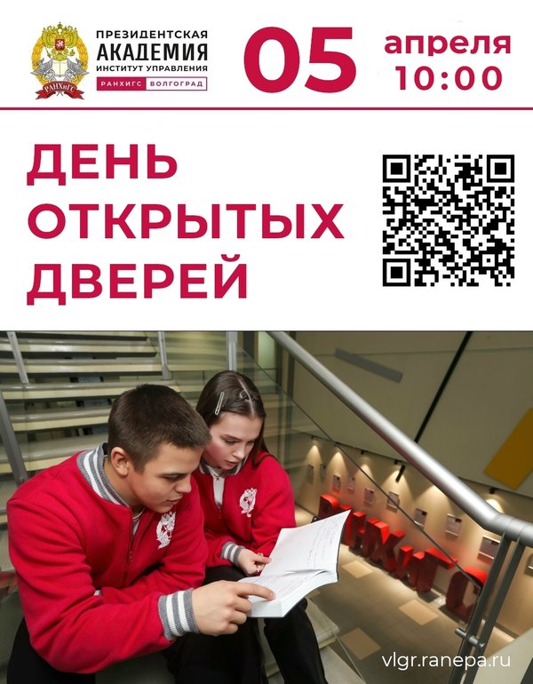 Приглашаем на День открытых дверей Президентской академии в Волгограде! Дорогие абитуриенты и родители, приглашаем вас на День открытых дверей, где все желающие смогут познакомиться с Волгоградским институтом управления – филиалом Президентской академии, его образовательными программами и условиями поступления. Когда? 05 апреля 2026 в 10.00 Где? г. Волгоград, ул. им. Гагарина, 8. Регистрация: За дополнительной информацией обращайтесь в Приемную комиссию ВИУ РАНХиГС (пн-чт: 9:00 – 17.00; пт: 9.00 – 15.45): priem-vlgr@ranepa.ru