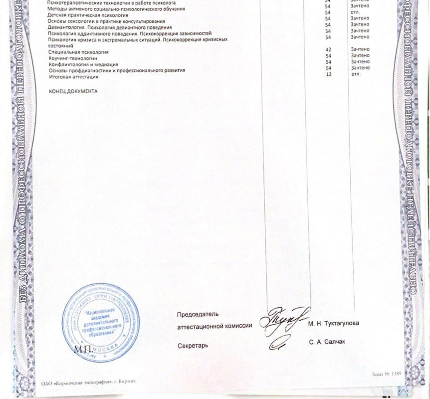 2018–2019 — АНО ДПО "НАДПО" "Психолог-консультант. Методы и технологии оказания психологических услуг населению и организациям