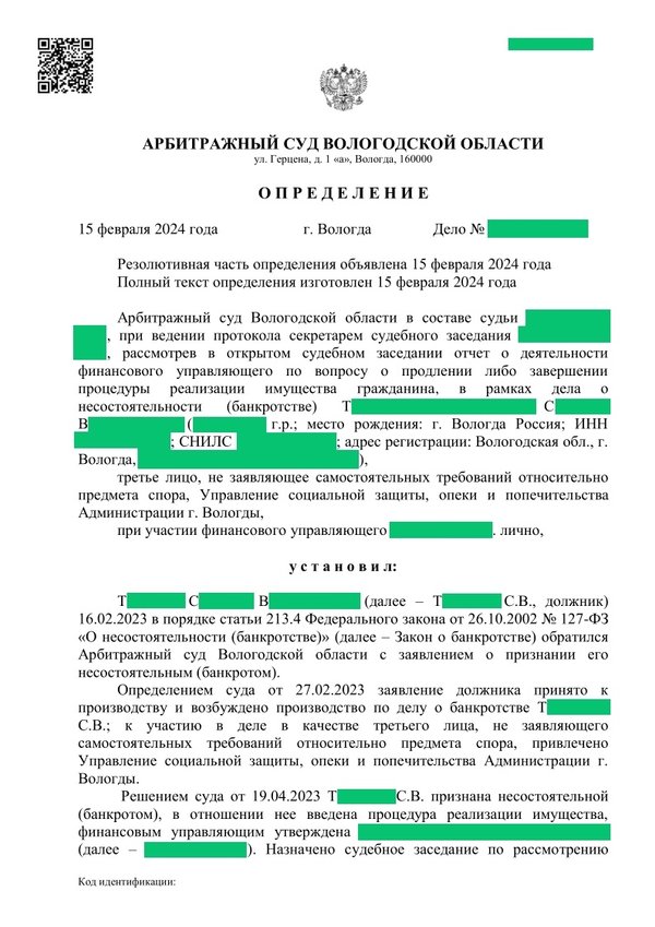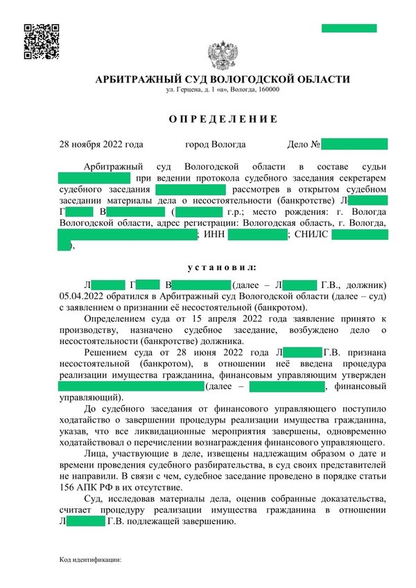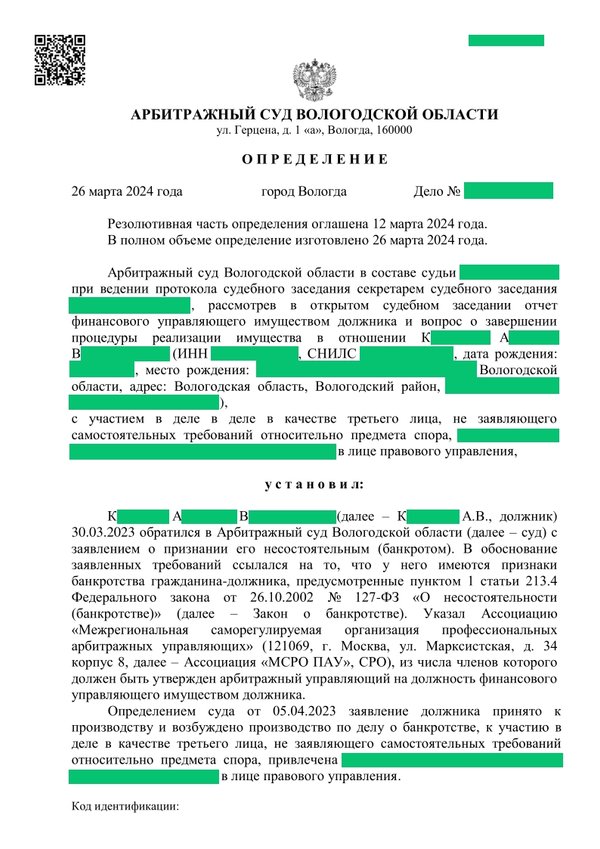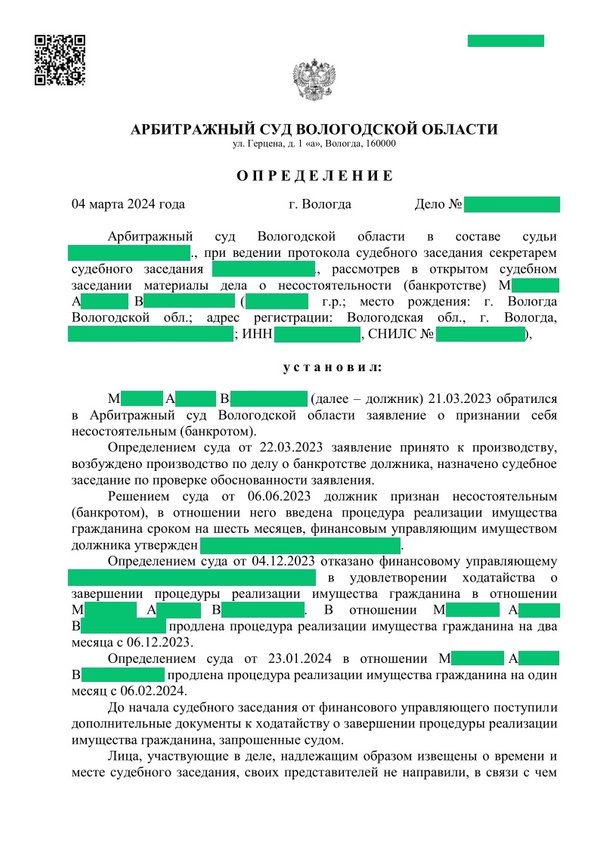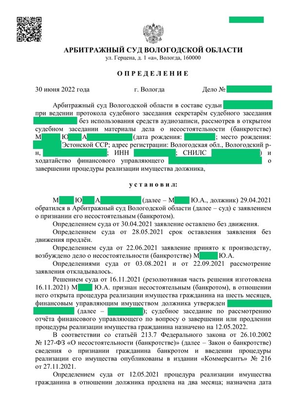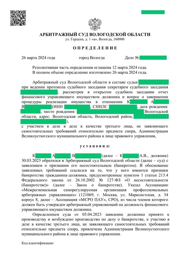 У предпринимателя из Вологды прогорел бизнес. Остались большие долги в размере более 3,2 млн руб. Мужчина не мог рассчитаться с банками и обратился ко мне за помощью. В результате долг списан полностью. Решение арбитражного суда можно посмотреть в прикреплённых документах. Возможно, у Вас или Ваших близких есть проблемы с кредитами, не получается платить. Вы также можете обратиться за помощью ко мне в личные сообщения.