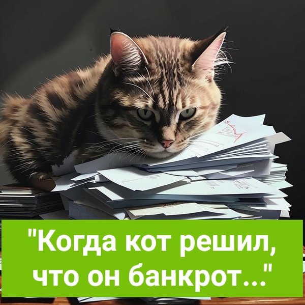 «Когда твой кот решил, что пора объявлять себя банкротом после того, как разорился на лакомствах. Кажется, его стратегия по накоплению не сработала… Но, возможно, ему стоит попробовать реструктуризацию задолженностей или пройти процедуру банкротства. Если ты, как и кот, чувствуешь, что запутался в финансовых вопросах, пиши в л/с, чтобы получить помощь! Узнай, как выйти из финансового кризиса с минимальными потерями.»