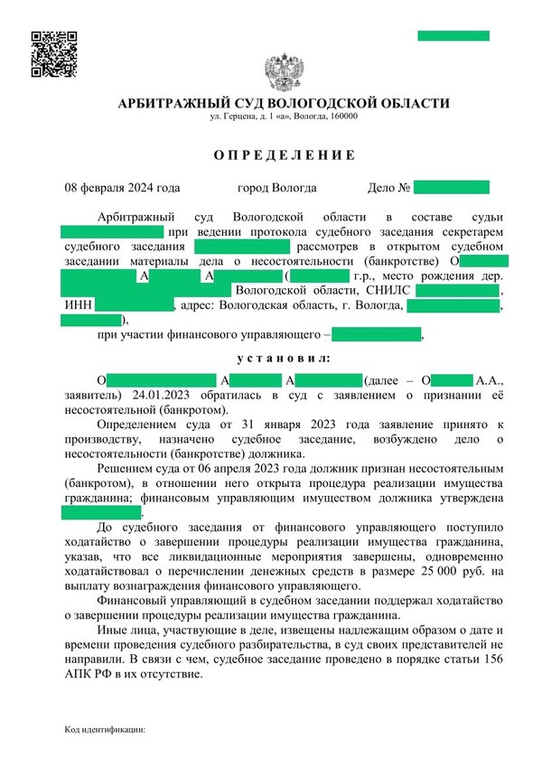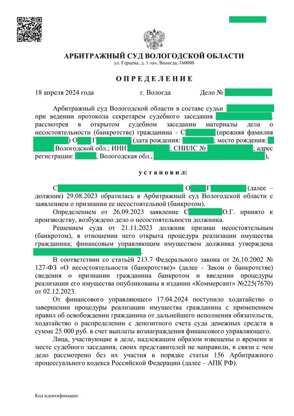 ится в залоге и не выведено из-под обременения. Арбитражный управляющий поработал над тем, чтобы снять ипотеку и сохранить крышу над головой семьи. Также выяснилось, что на жену должника оформлена машина. К счастью, из-за её низкой ликвидности она была выведена из конкурсной массы и осталась в собственности. В результате требования кредиторов не были удовлетворены, и долг был полностью списан, дав семье долгожданное облегчение. Решение арбитражного суда можно посмотреть в прикреплённых документах. Возможно, у Вас или Ваших близких есть проблемы с кредитами, не получается платить. Вы тоже можете обратиться ко мне за помощью. Телефон: Или написать сюда: