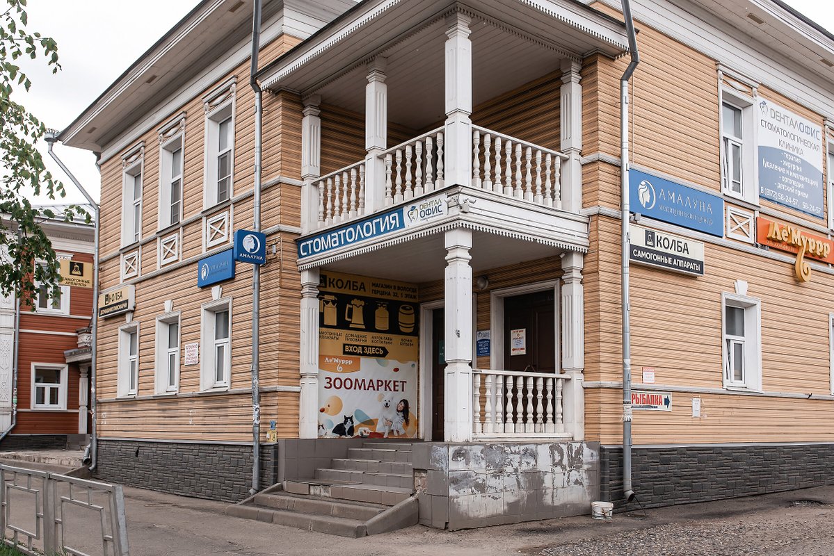 1. Она расположена со стороны двора по адресу: Герцена, 32 (МЦ «Амалуна»)