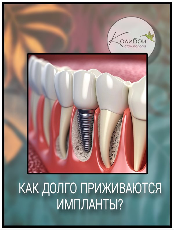 нованные на исследованиях: · В среднем, на нижней челюсти имплант приживается 2—4 месяца. Здесь кость более плотная, кровоснабжение лучше. · На верхней челюсти процесс занимает дольше — от 4 до 6 месяцев. Кость здесь более пористая, а близость гайморовых пазух добавляет нюансов. Кроме того, время остеоинтеграции зависит от кучи факторов: · Качество кости: Если был дефицит костной ткани и делали костную пластику, сроки могут увеличиться. · Общее здоровье: Курение и такие заболевания, как диабет, значительно замедляют заживление. Исследования показывают, что у курильщиков риск отторжения импланта в 2—3 раза выше! · Место установки: Жевательные зубы несут большую нагрузку, и врач может рекомендовать выждать более длительный срок перед протезированием. ️Не путайте «приживление импланта» с «заживлением десны». Внешне все заживет за пару недель, но внутри новый титановый «корень» (имплант и предназначен выполнять функцию корня зуба) будет «прирастать», чтобы служить вам долгие годы. Вывод: Наберитесь терпения! Срок в 3—6 месяцев — это инвестиция в надежность, которая прослужит вам десятилетиями. Следуйте рекомендациям вашего врача, наберитесь терпения — результат того стоит!