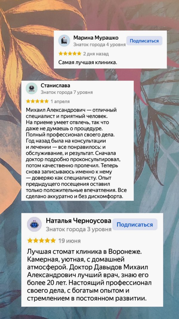 Спасибо нашим пациентам за то, что находят минутку оставить отзыв о нашей работе Готовы оказывать стоматологическую помощь широкого спектра — от профессиональной гигиены полости рта до костно-пластических операций и имплантаций