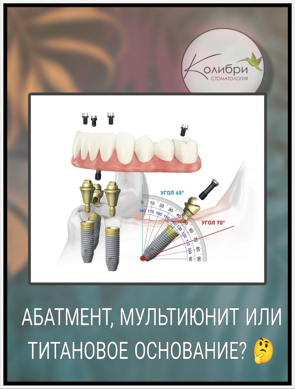 ми есть специальный «переходник», который выбирается исходя их конкретной ситуации. Абатмент — Универсальный связной. · Что это? Цилиндрический элемент-посредник, который вкручивается в имплант и служит опорой для будущей коронки. · Зачем нужен? Чтобы надежно соединить два главных элемента и передавать жевательную нагрузку с коронки на имплант. · Каким бывает? Стандартный (готовый) или индивидуальный (изготовленный на заказ по цифровым слепкам для идеального прилегания). Мультиюнит (Multi-Unit) — Абатмент с функцией коррекции. · Что это? Усовершенствованный абатмент, состоящий из двух частей. Его ключевая особенность — возможность изменения угла наклона (до 30—40 градусов). · Зачем нужен? Он настоящий спасатель, когда имплант установлен под неидеальным углом (например, из-за анатомии челюсти). Мультиюнит выравнивает положение коронки, делая ее ровной и эстетичной. Незаменим при комплексном протезировании на несколько имплантов (all-on-4, all-on-6). Титановое основание (или шаровидный абатмент) — Фундамент для съемного протеза · Что это? Небольшой металлический элемент с шарообразной головкой, который вкручивается в имплант. · Зачем нужен? Для фиксации съемных зубных протезов. Внутри протеза находятся силиконовые матрицы, которые, как кнопки, защелкиваются на эти титановые шарики. Протез держится очень прочно, но его можно снять для гигиены. ️Выбор компонента— это не прихоть, а точный инженерный расчет, который зависит от вашей клинической ситуации. Правильно подобранный абатмент — залог долговечности, удобства и безупречного вида вашей новой улыбки Доверяйте свое здоровье профессионалам!