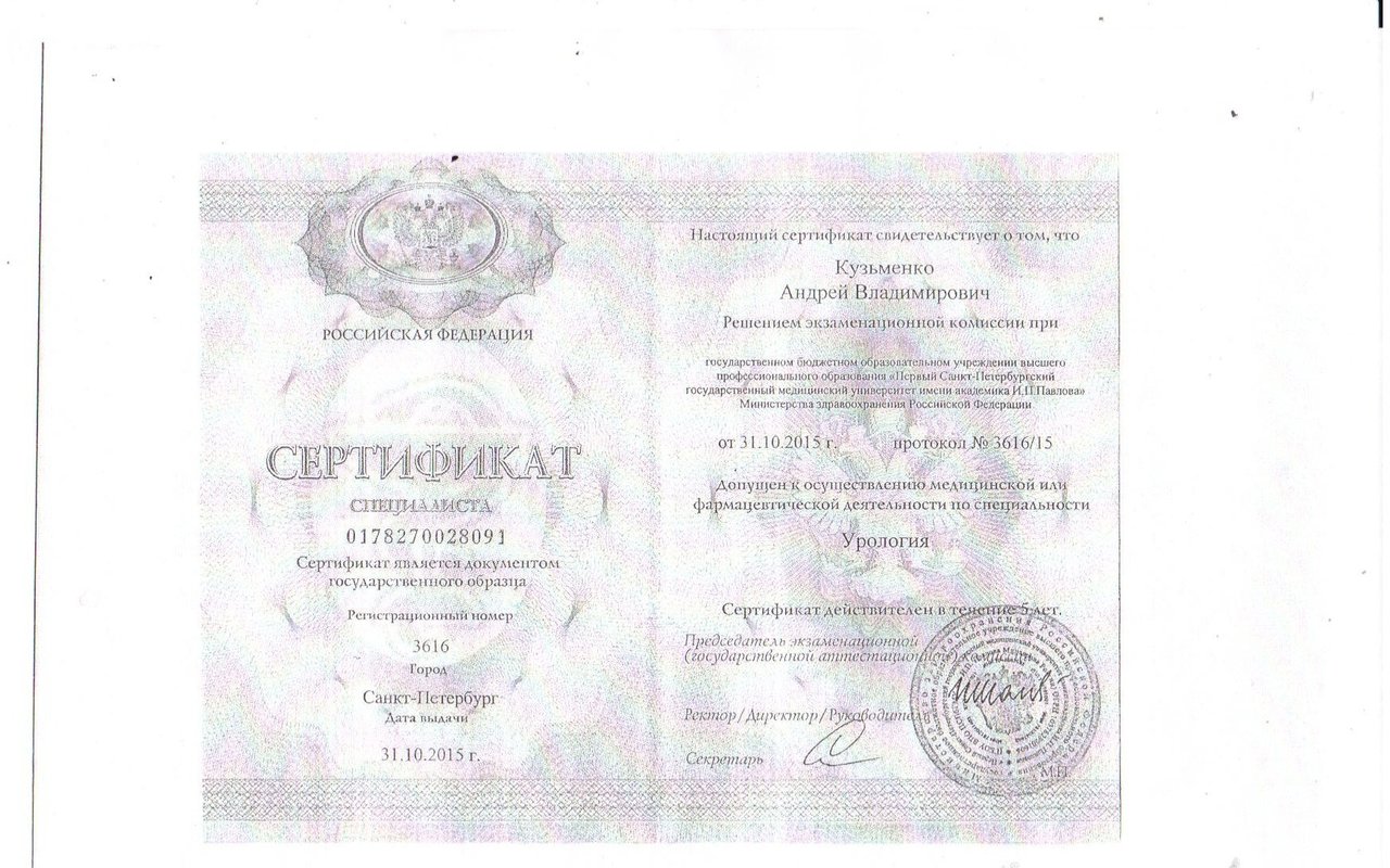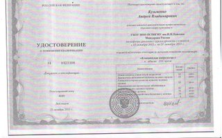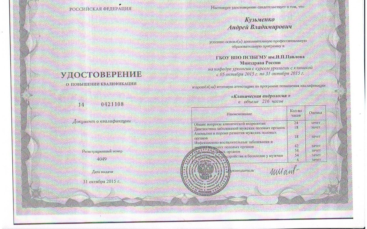 2015 — Удостоверение о повышении квалификации ГБОУ ПСПбГМУ им. И.П. Павлова и прохождение итоговой аттестации по программе повышения квалификации «Клиническая андрология»