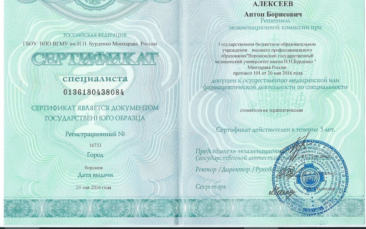 2016 — Воронежская государственная медицинская академия им. Н.Н. Бурденко (стоматология терапевтическая)