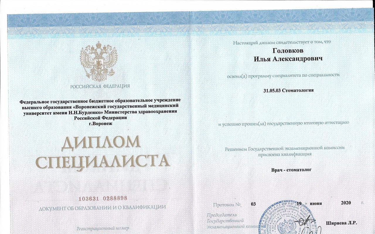 2020 — ГБОУ ВПО "Воронежская государственная медицинская академия имени Н.Н.Бурденко" Министерства здравоохранения и социального развития РФ, 19.06.2020, Врач - стоматолог