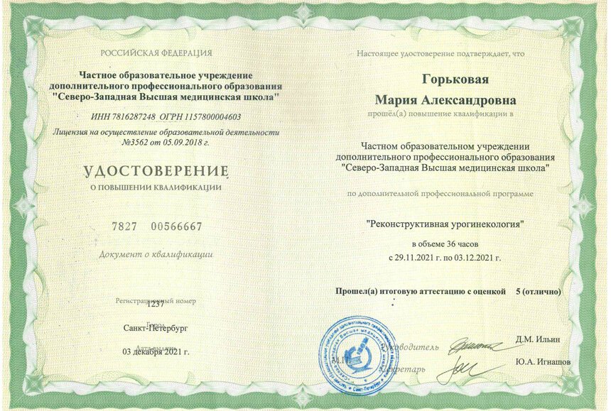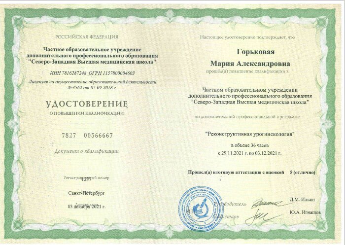 2021 — повышение квалификации в частном образовательном учреждении дополнительного профессионального образования «Северо-Западная Высшая медицинская школа» по программе «Реконструктивная урогинекология»