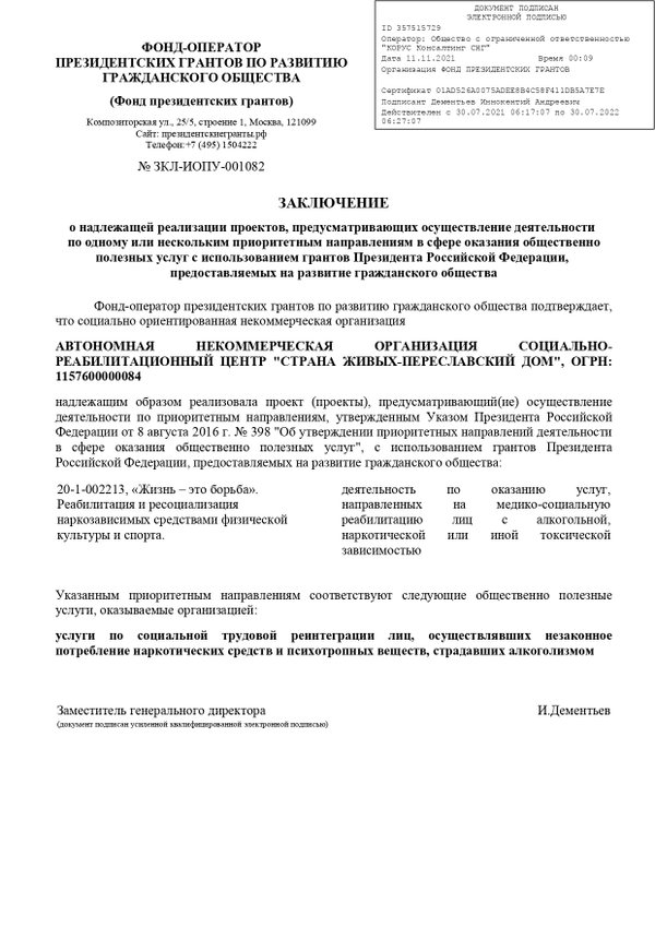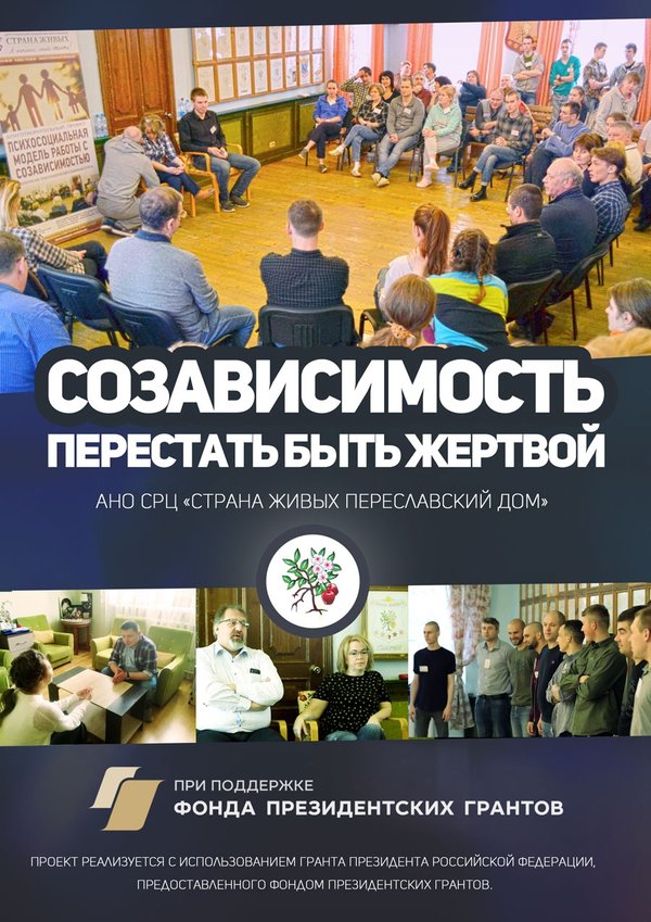 е шаги им необходимо предпринять, чтобы повлиять на зависимого человека и убедить его лечиться. Каждый обратившийся созависимый получил психологическую поддержку и знание, что он теперь не одинок перед проблемой. Эффект от проведённых телефонных консультаций отразился в том, что некоторые из обратившихся записались на проведение очных консультаций в режиме индивидуального семейного консультирования, то есть продолжили работу по преодолению созависимого поведения. Кроме того, со сформированной в психотерапевтической группой, состоящей из 20 созависимых членов семей алко и наркозависимых людей, проходящих в данный момент программу реабилитации в АНО СРЦ «Страна живых — Переславский дом». Продолжилось проведение с группой занятий. Участие в группе помогает сформировать доверительные отношения среди семей зависимых, благодаря проводимой работе появляется мотивация на работу в программе. В группе формируется понимание специфики процесса реабилитации, созависимые родственники видят свое место в этом процессе и осознают свои действия и их последовательность. Появляется мотивация на личностный рост, на принятие поддержки от окружающих, усваиваются знания о взаимоотношениях, построенных на доверии и понимании близких. Проект «Созависимость. Перестать быть жертвой» реализуется при поддержке фонда Президентских грантов.