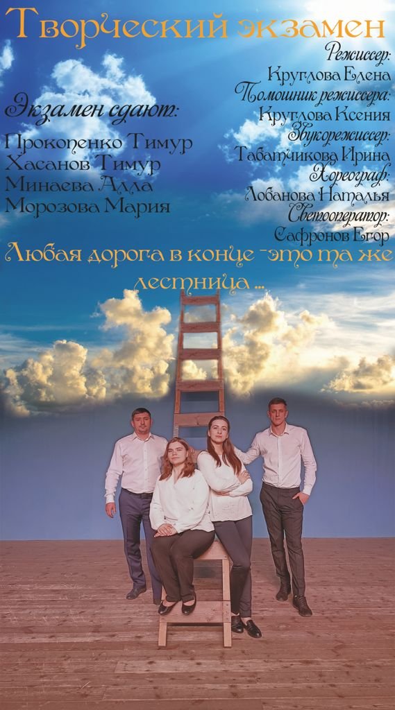 В первый показ экзамена я не мог сдерживать эмоции. Ребята рассказывали о своей наркоманской жизни, как они отдалились от семьи, как сломалась их жизнь, и они потеряли себя, это так все мне знакомо потому что я сам прошел через все это. И вот на сцене мы видим, как ребята в черных футболках с черными душами бродят и не могут найти себя. Но вот они начинают разбираться в себе, преодолевать свой пороки и слабости. И вот в конце мы видим светлых, искренних и честных ребят в белых рубашках, которые научились жить без наркотиков и обрели любовь.
