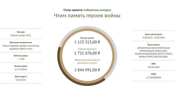 Во втором конкурсе 2021 года проект «Чтим память героев войны» получил грант в размере 1 123 315 рублей.