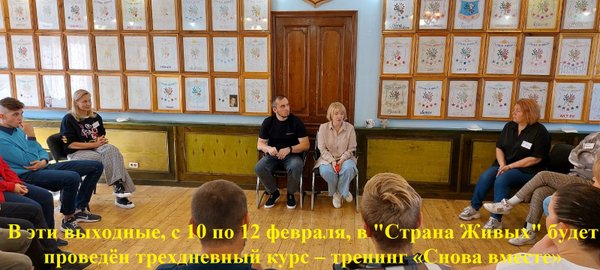 Сегодня, в «Страна Живых» в 17 :00 начнётся трехдневный курс – тренинг «Снова вместе». Это курс — тренинг для семей наркозависимых. Основная задача курса – восстановить связи между близкими и родными людьми, которые были разрушены за годы пристрастия к наркотику одного из членов семьи, а также осознание и преодоление созависимости членами семей. Курс продлится в течение трёх дней и закончится вечером 12 февраля.
