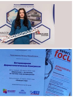 ветеринар-дерматологЗабота о ваших питомцах - первоочередная задача, которая стоит перед работниками в области ветеринарии. В процессе эволюции человека приручение диких зверей привело к необходимости возникновения профессии ветеринара как отдельного специалиста, отвечающего за их здоровье - как раз таким и работает Герасименко Регина. Сегодня ветеринары как никто умеют на должном уровне оказать помощь как привычным нам собакам и кошкам, так и экзотическим видам.